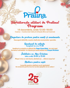 Pe 14 decembrie, Cofetăria Pralina aniversează 25 de ani de la prima prăjitură, printr-un eveniment dedicat clujenilor, care va avea loc la Casino – Centru de Cultură Urbană, între orele 12:00 și 19:00. Clădirea din Parcul Central se va transforma într-un loc feeric de sărbători, plin de dulciuri, colinde, decoruri de poze și surprize. Invitatul de onoare al zilei este chiar Moș Crăciun, care va fi prezent la eveniment și va împărți daruri micilor participanți. Participarea la eveniment este gratuită.